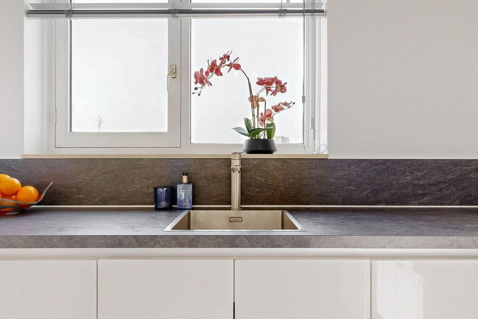 De moderne keuken (2021) is uitgevoerd in een witte, greeploze hoogglans opstelling en voorzien van diverse inbouwapparatuur.