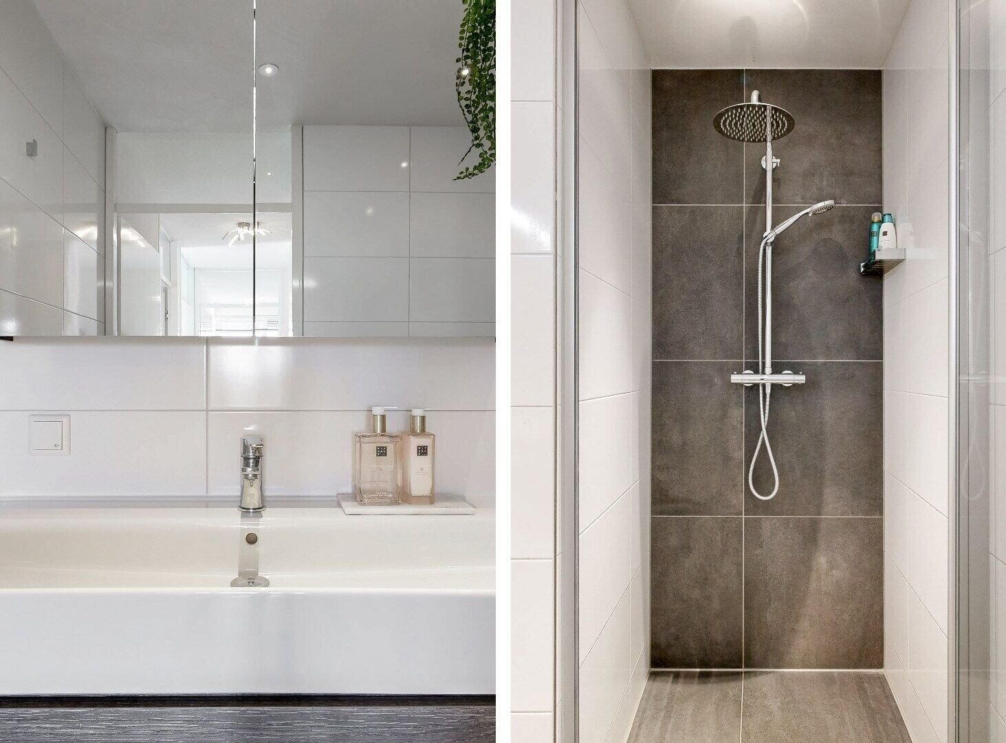 De badkamer is eveneens in 2022 gerenoveerd en beschikt over een stijlvol badkamermeubel, een douchehoek met glazen douchedeur en fraai weggewerkte aansluitingen voor wasmachine en droger, netjes verborgen achter een glazen deur. Dankzij de vloerverwarming geniet u hier van extra comfort.